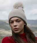 50% recycled polyester/34% nylon/13% acrylic/3% elastane. Heavy ribbed knit. Soft touch fabric. Retro styling. Cuffed design. Luxury faux fur pom pom. Tear out label.